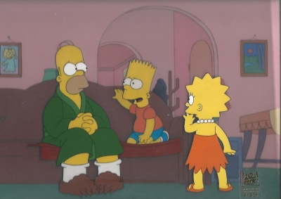 Homer Simpson with Bart and Lisa on the couch