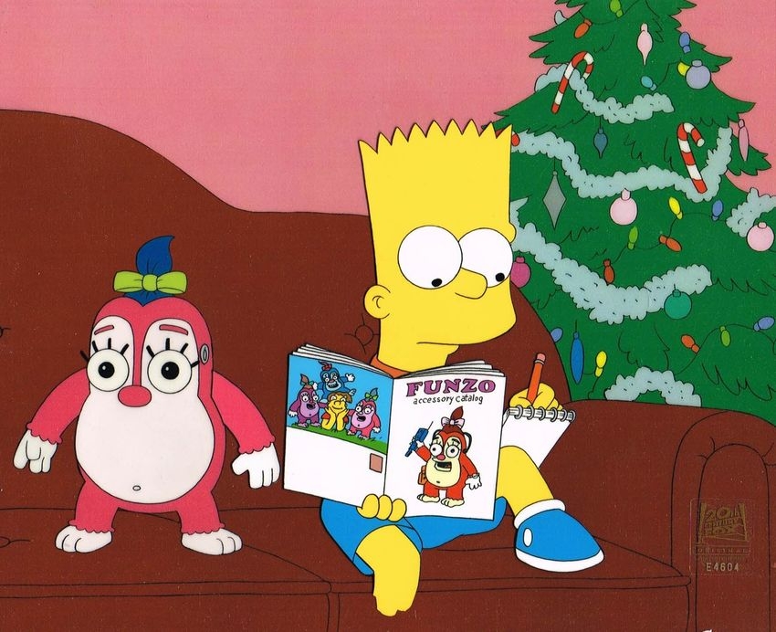This is an original production cel used in making an episode of "The Simpsons". Episode title "Grift of the Magi", 1999. A toy company purchases Springfield Elementary and uses the student body as a focus group for their new Christmas toy Funzo. Featured here is Bart Simpson and Funzo.475