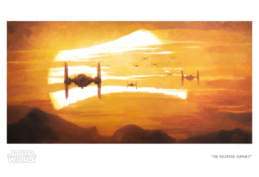 This is a limited edition giclee on paper. Inspired by Star Wars: The Force Awakens. This painting combines the stunning beauty of a sunset landscape with the ominous sight of an invading legion of TIE Fighters. Feel the heat radiating throughout the scene as the tension builds toward imminent battle.