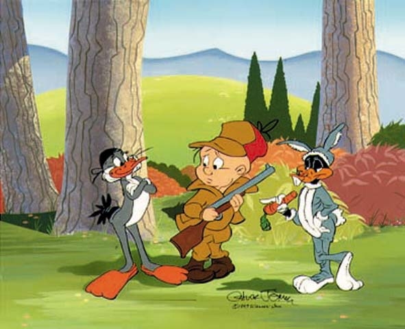 This is a hand painted limited edition cel. Featured here is Bugs Bunny, Daffy Duck and Elmer Fudd. The confusion never ends for Elmer Fudd on who to shoot. This is signed by Chuck Jones. Very low quantity.