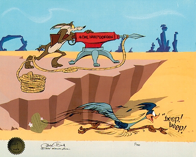 This is a hand painted limited edition cel. Signed by Chuck Jones featuring Wile E. Coyote and Road Runner.