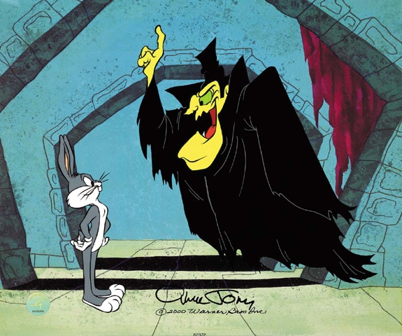 This is a hand painted limited edition cel. Signed by Chuck Jones featuring Bugs Bunny and Count Blood Count. Transylvania 6-5000 (1963) is a Merrie Melodies animated short directed by Chuck Jones and starring Bugs Bunny. It is notable as the last original Bugs Bunny short Mr. Jones made for Warner Bros. before leaving for MGM to found his own studio, Sib Tower 12 Productions. It was his second-to-last cartoon at Warner Bros. before moving to MGM, and the second-to-last Warner cartoon made 1963.