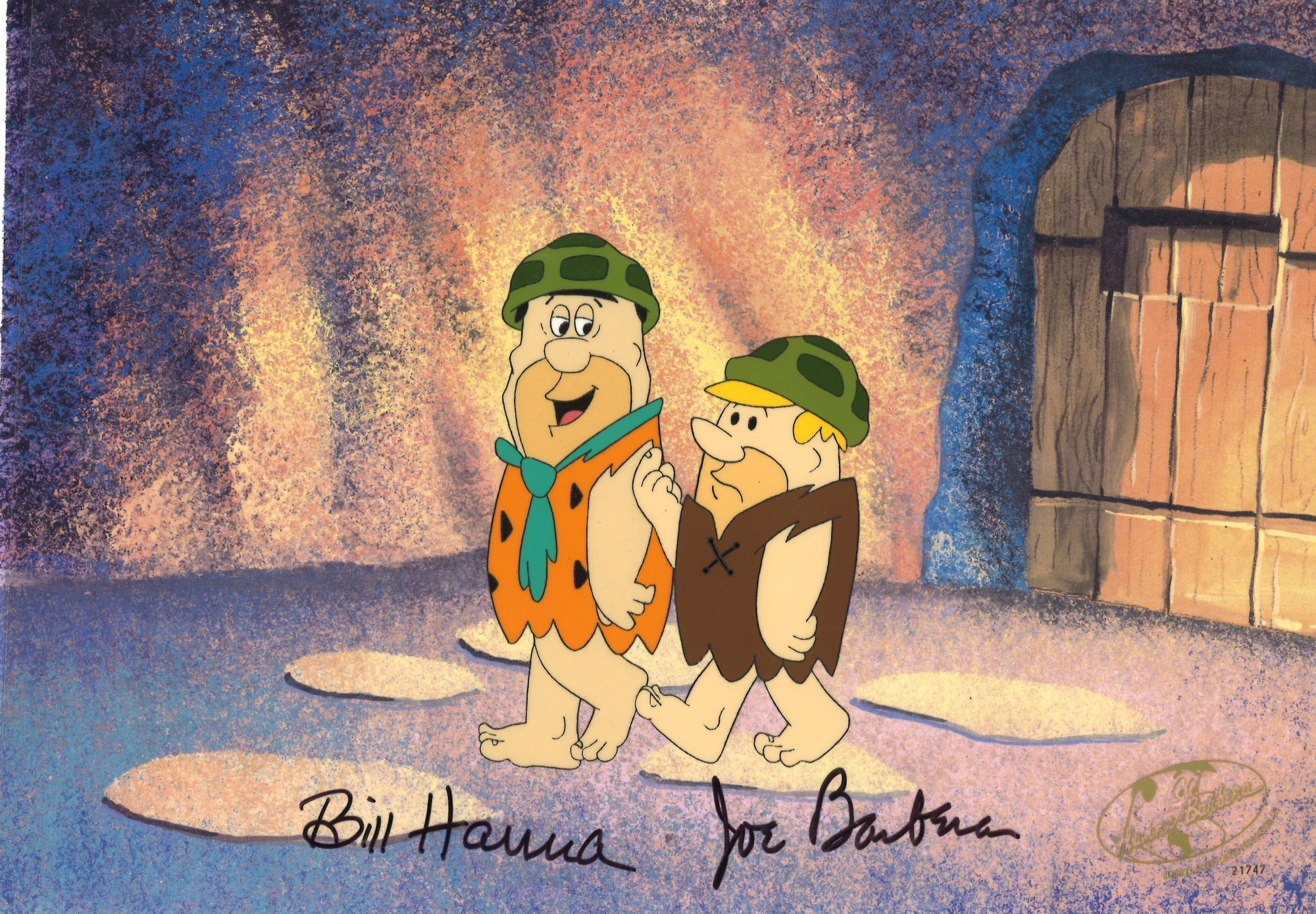 This is an original production cel used in making "Jetsons Meet the Flintstones" 1987. Featured here is Fred Flintstone and Barney Rubble. This is signed by Bill Hanna and Joe Barbera.525