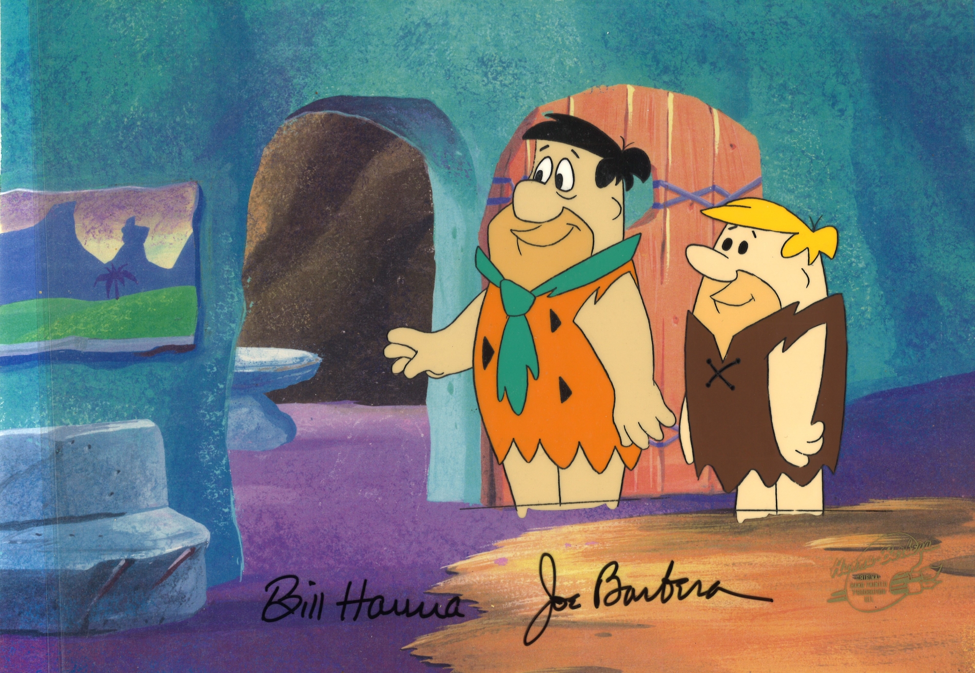 This is an original production cel used in making "Jetsons Meet the Flintstones" 1987. Featured here is Fred Flintstone and Barney Rubble. Signed by Bill Hanna and Joe Barbera. 525