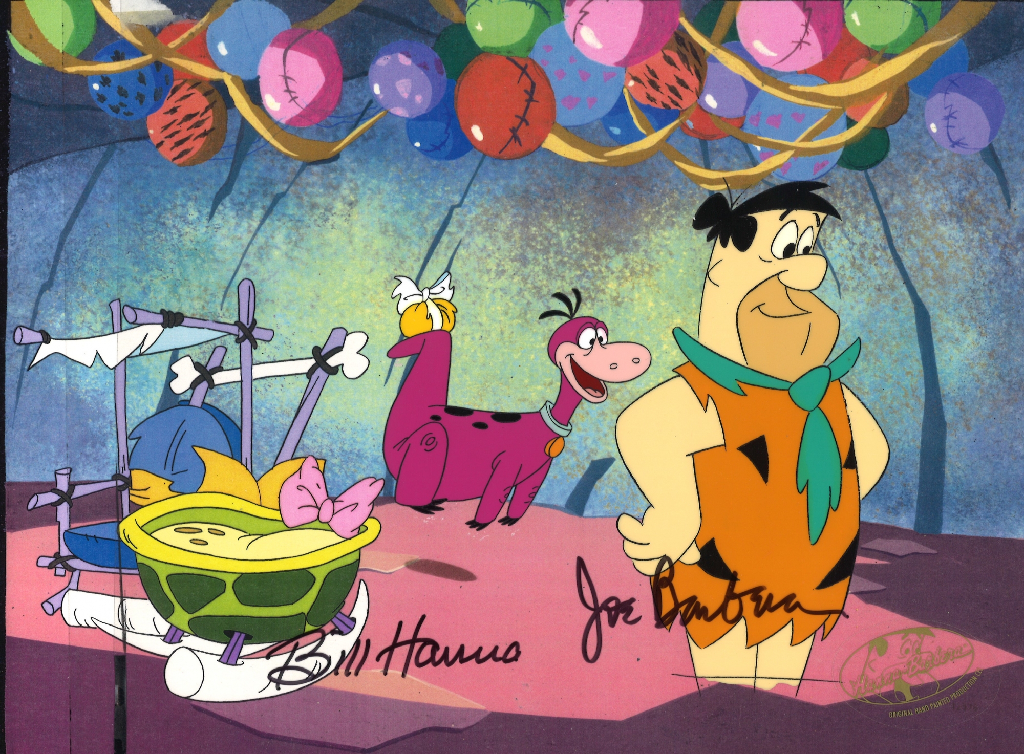 This is an original production cel used in making "Holly Rock A Bye Baby" 1993. Featured here is Fred Flintstone and Dino. Signed by Bill Hanna and Joe Barbera. 525