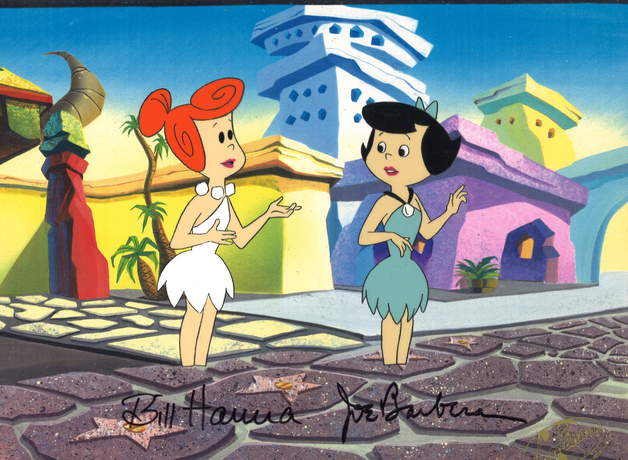 This is an original production cel used in making "Jetsons Meet the Flintstones" 1987. Featured here is Wilma Flintstone and Betty Rubble. Signed by Bill Hanna and Joe Barbera. 525