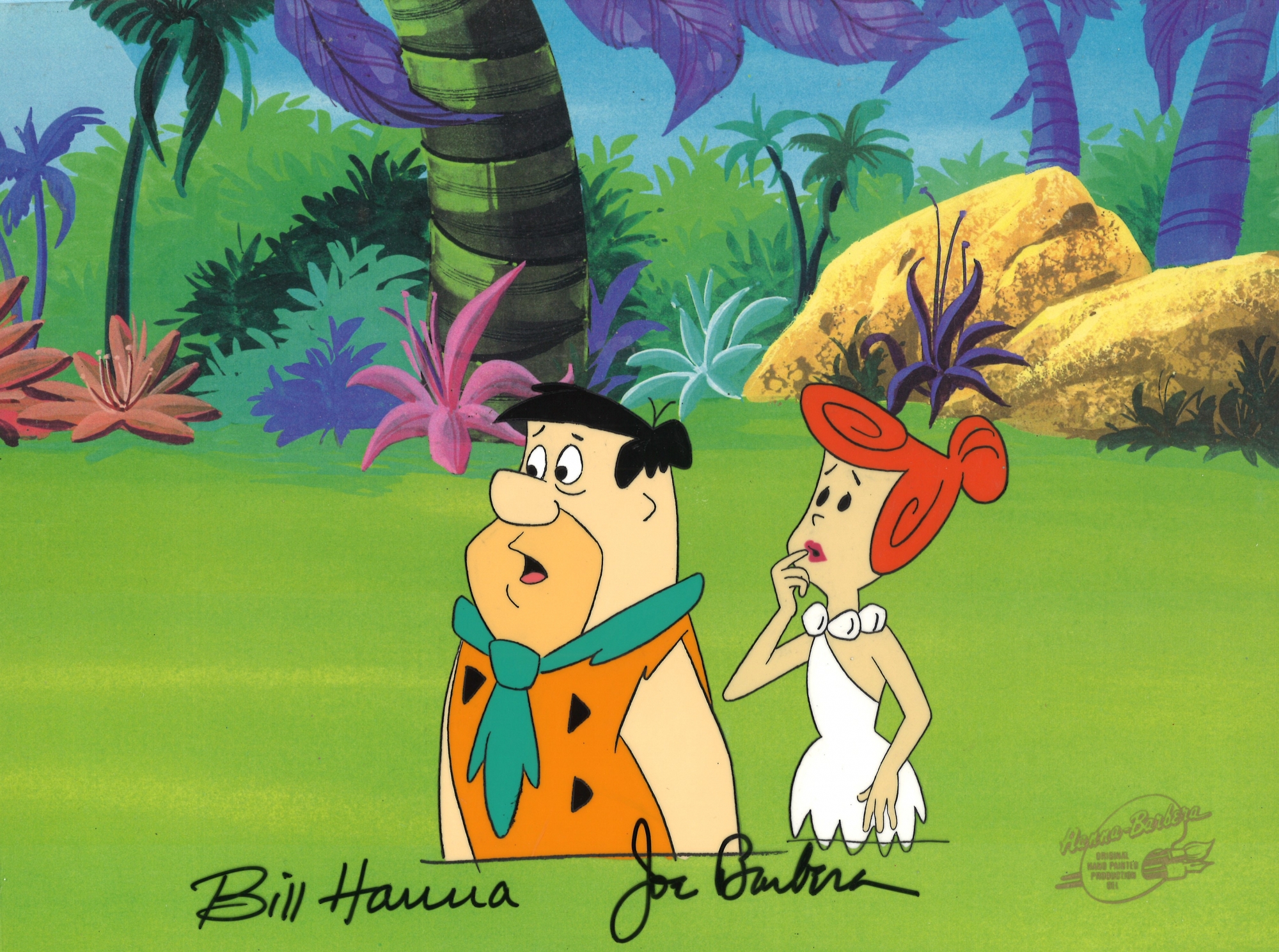 This is an original production cel used in making "Jetsons Meet the Flintstones" 1987. Featured here is Wilma Flintstone and Fred Flintstone. Signed by Bill Hanna and Joe Barbera. 550
