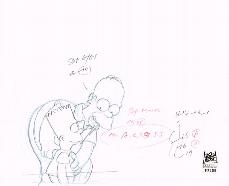 This is an original production drawing used in making an episode of "The Simpsons". Episode title "Bart the Daredevil" 1990 (season 2). Featured here is Homer and Bart.200
