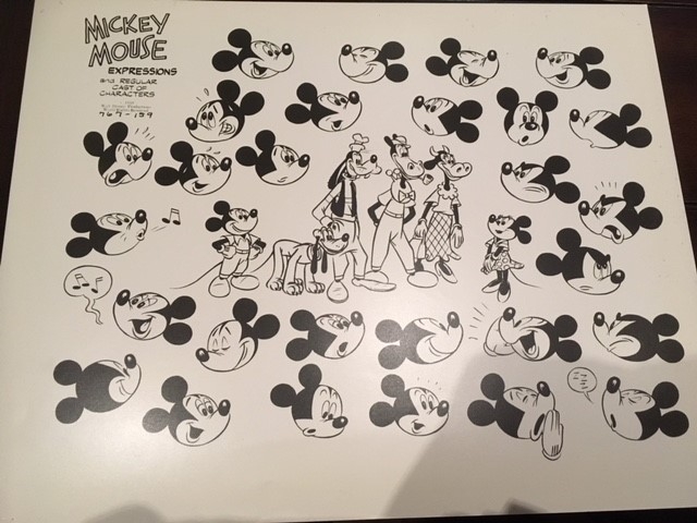 This is an original model sheet used in making a Walt Disney Production 1959. There are a number of Mickey Mouse heads to show expression and in the center we have Pluto, Goofy, Clarabelle cow and Horace Horsecollar.250