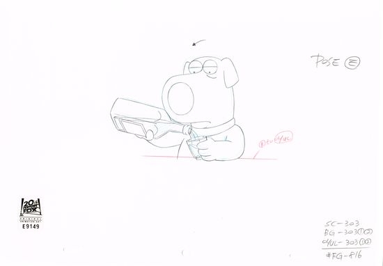 This is an original production drawing used in making an episode of "Family Guy". Episode title "Tiegs for Two", April 10, 2011 (Season 9). Featured here is Brian.140