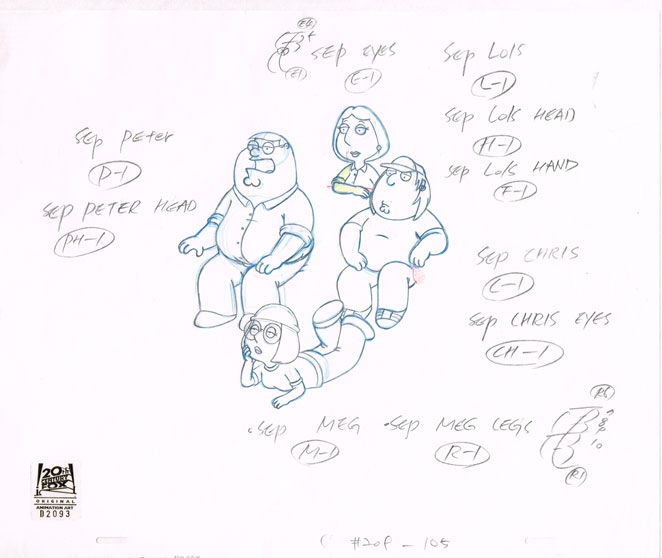 This is an original production drawing used in making an episode of "Family Guy". Episode title "Dammit Janet!", June 13, 2000 (Season 2). Featured here is Peter, Chris, Meg and Lois.180