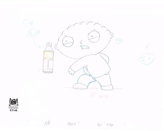 This is an original production drawing used in making an episode of "Family Guy". Episode title "Brian Writes a Bestseller", Nov. 21, 2010 (Season 9). Featured here is Stewie.140