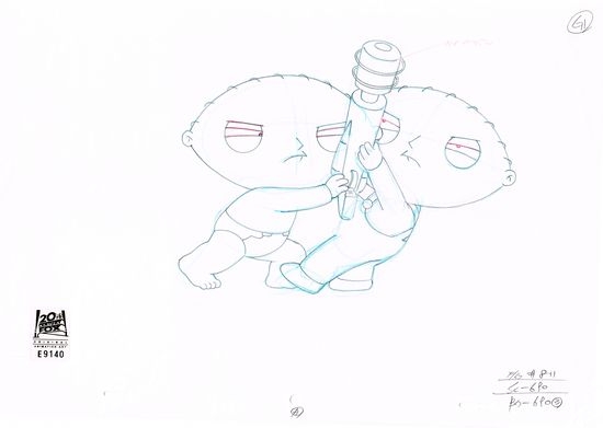 This is an original production drawing used in making an episode of "Family Guy". Episode title "Hand That Rocks the...", March 6, 2011 (Season 9). Featured here is Stewie and evil Stewie.140