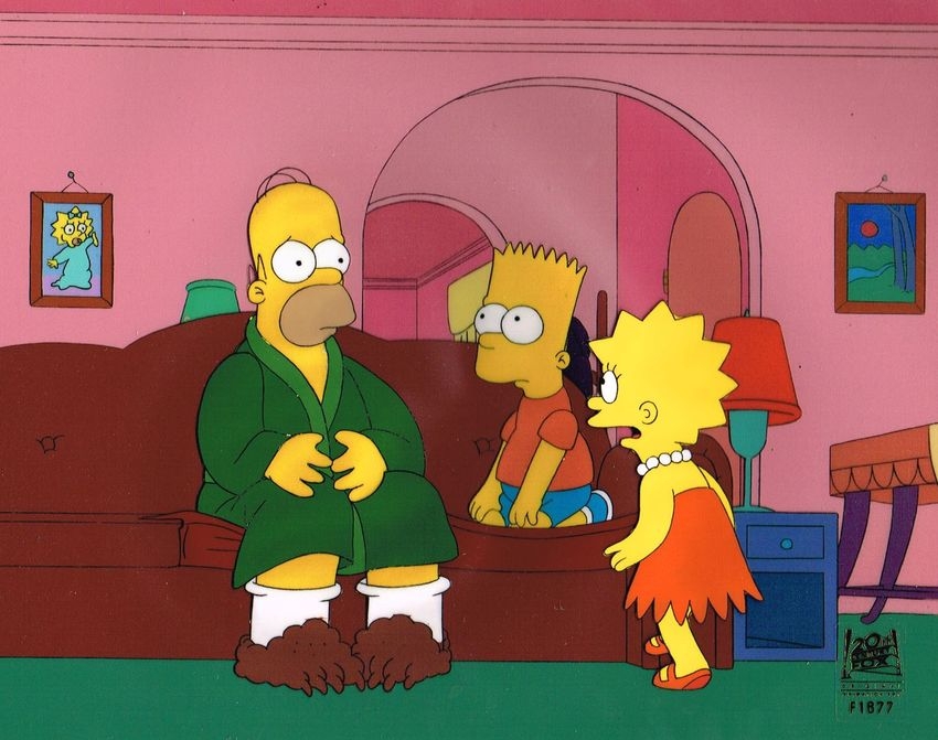 This is an original production cel used in making an episode of "The Simpsons". Episode title "Homer Badman", November 27, 1994 (Season 6) . Featured here is Homer, Bart and Lisa. 510