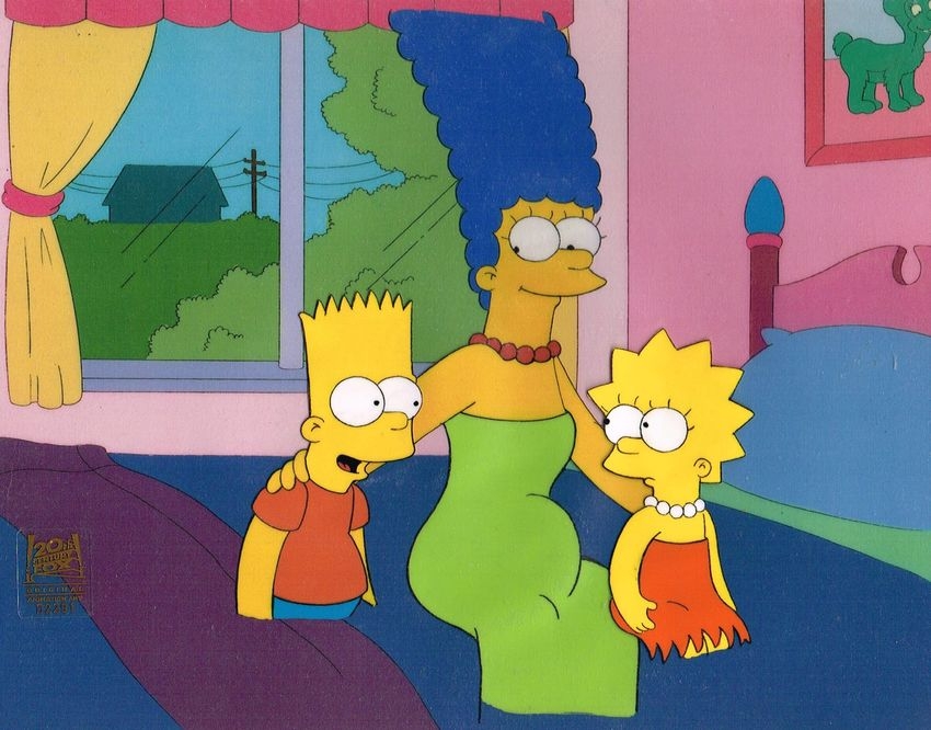 This is an original production cel used in making an episode of "The Simpsons". Episode title "And Maggie Makes Three", January 22, 1995 (Season 6) . Featured here is Bart, Lisa and Marge.490