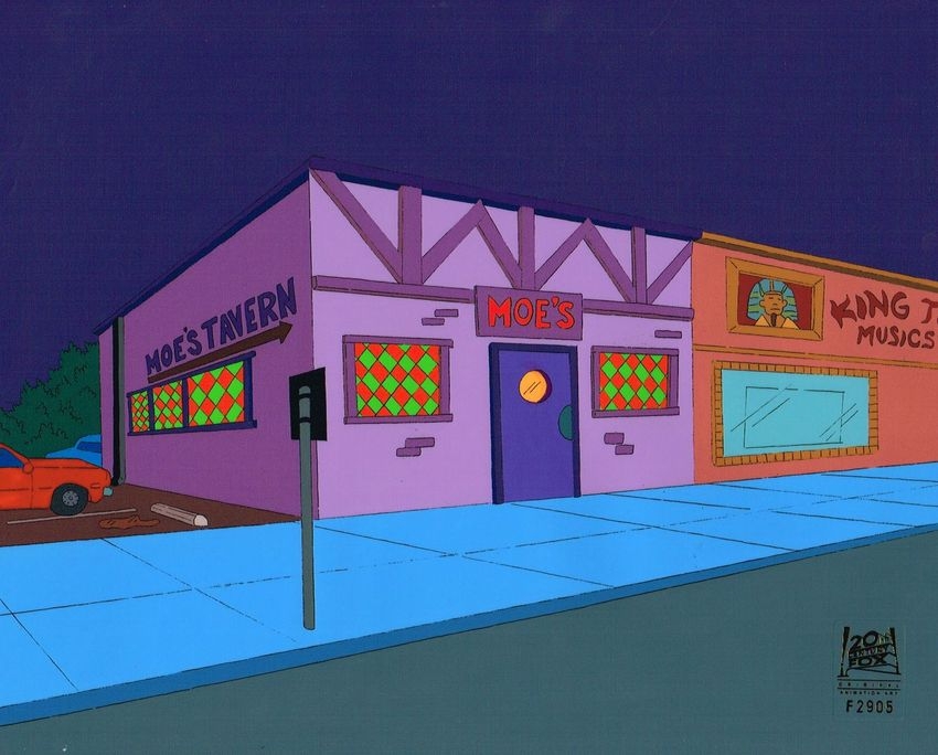 This is an original production background used in making an episode of "The Simpsons". Episode title "Flaming Moe's", November 21, 1991 (Season 3). Featured here is Moe's bar.