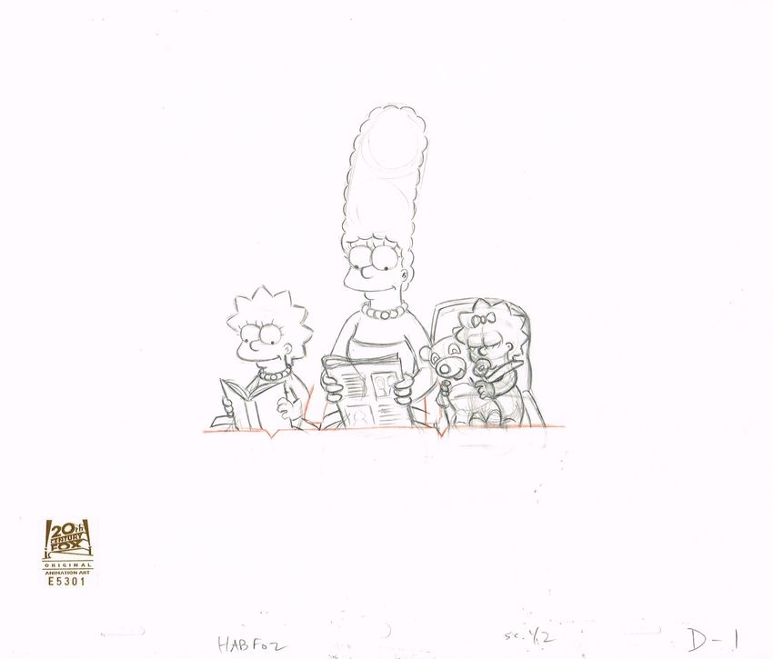 This is an original production drawing used in making an episode of "The Simpsons". Episode title "The Italian Bob", December 11, 2005 (Season 17). Featured here is Marge Simpson, Maggie and Lisa.180