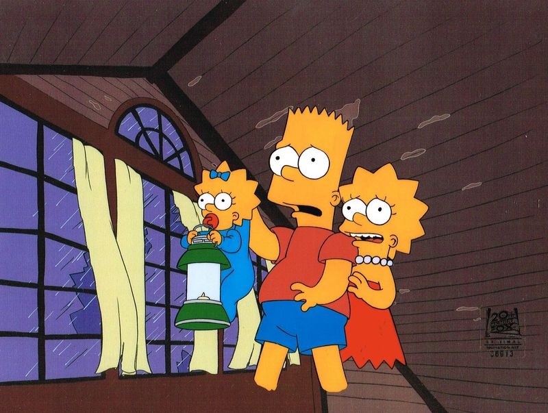 This is an original production cel used in making an episode of "The Simpsons". Featured here is Bart, Lisa and Maggie. Episode title "Treehouse of Horror Vll", 1996.490