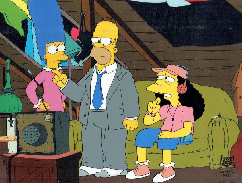 This is an original production cel used in making an episode of "The Simpsons". Featured here is Marge Simpson, Homer and Otto. 510