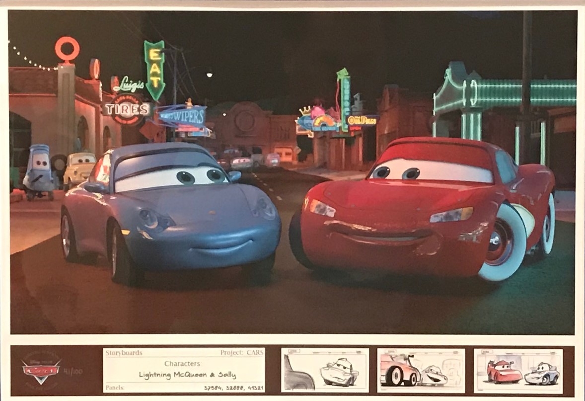 This is a limited edition giclee on paper. Lighting McQueen is a hotshot rookie race car who suddenly finds himself unexpectedly detoured in the sleepy town of Radiator Springs. 495