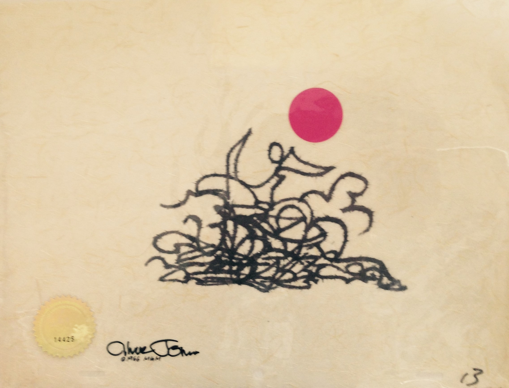 This is a beautiful hand painted production cel with rice paper drawing that was used to make "The Dot and the Line" 1966. Featured here is Dot and Squiggle. This was personally signed by the late Chuck Jones.950