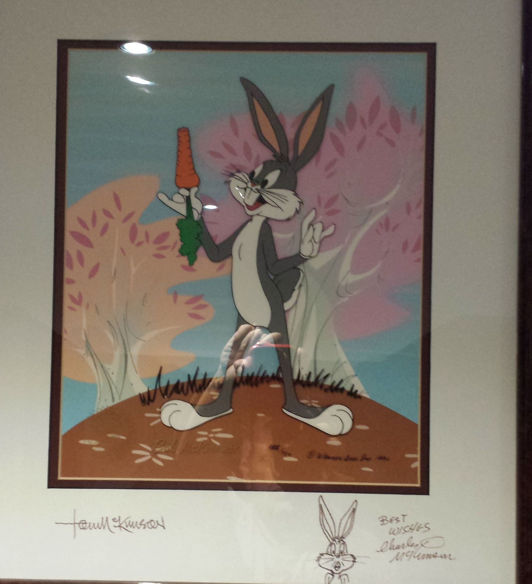 This is a hand painted limited edition cel featuring Bugs Bunny. The mat has been signed by Tom McKimson and also have a remark drawing of Bugs Bunny drawn by Charles McKimson. This item is sold framed "as is".