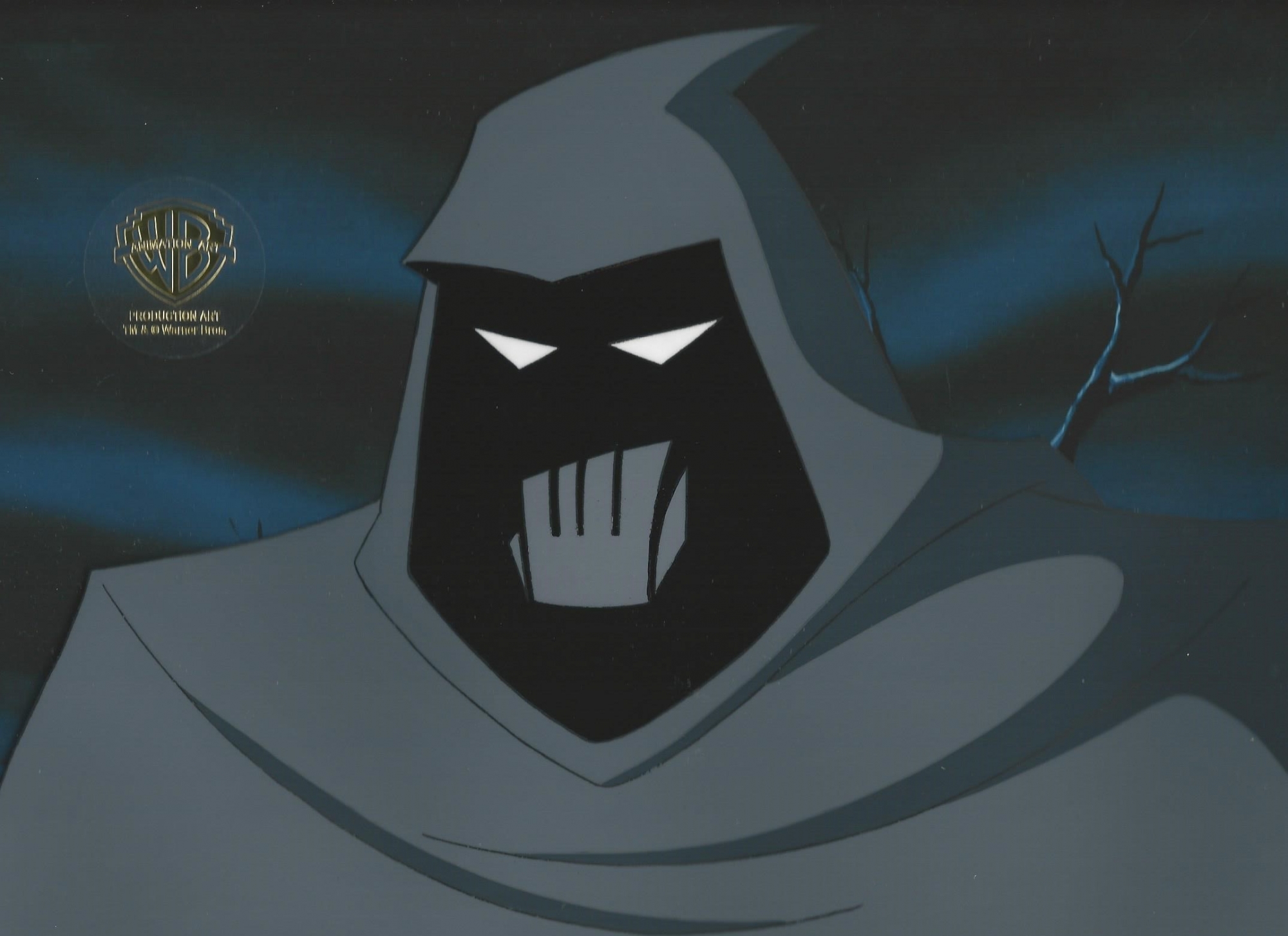 This is an original hand painted production cel used in making Warner Bros. animated film "Batman: The Mask of Phantasm" 1993. Featured here is Phantasm. The lore and legend of BATMAN have been told and retold in comic books, on television, and in motion pictures. Now, from Warner Bros. Animation, and a creative team who grew up with the exploits of the Dark Knight in all media, comes BATMAN: The Mask of Phantasm. Premiering in theaters on Christmas day 1993, the richly-produced feature film possesses the same mystique, "Dark Deco" look, and bizarre villains that epitomized Warner Bros." successful films. To some, he is merely a legend. To others, he is a dedicated, driven avenger. And to criminals, he is their worst nightmare. He is ...BATMAN. A mysterious, ethereal character in a death mask (PHANTASM) is stalking specific gangsters in Gotham City. Because of Batmans' resemblance to him the Dark Knight is mistakenly accused of the murders. As Batman investigates, he crosses paths with his ex-fiance, Andre Beaumont, who has just arrived in town to clear up some old family business. The minute they lay eyes on each other Andrea realizes to her astonishment that Batman is really Bruce Wayne. And this is how the story begins...475