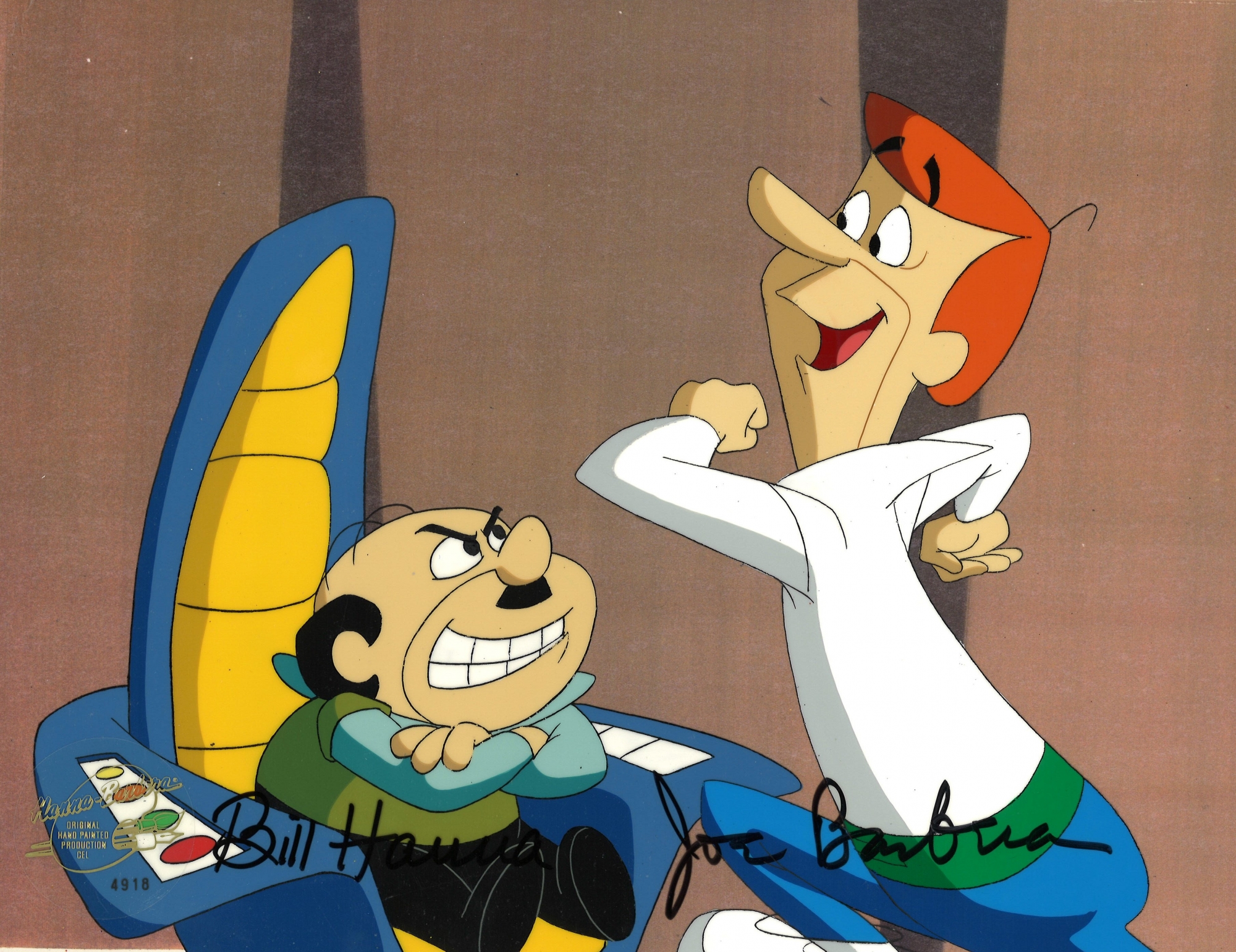 This is an original production cel used in making "Jetsons: The Movie" 1990. Featured here is George Jetson and his boss Mr. Spacely. This is signed by Bill Hanna and Joe Barbera. 550