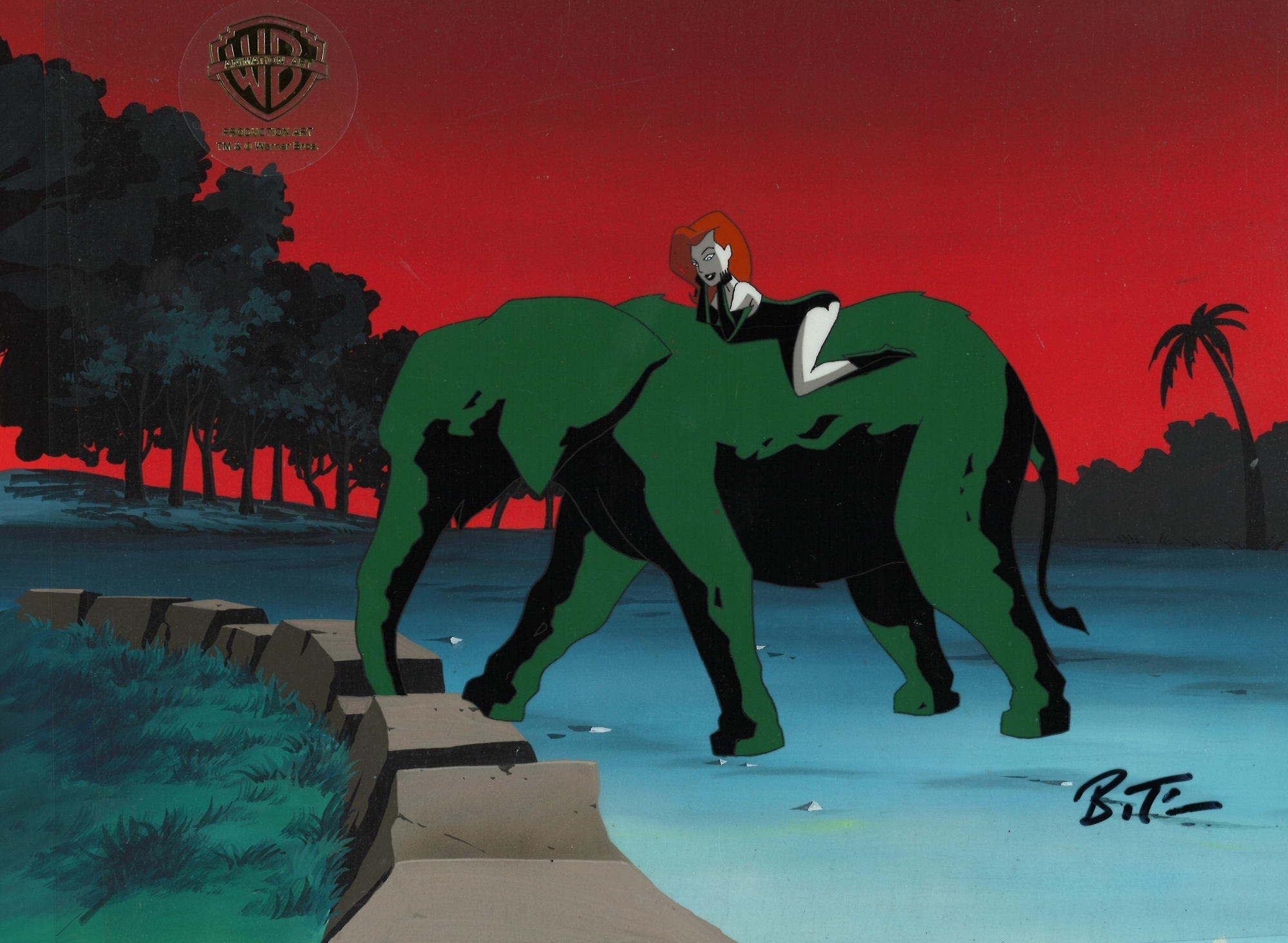 This is an original production cel on original hand painted production background featuring Poison Ivy. This cel has been personally signed by Bruce Timm. 800