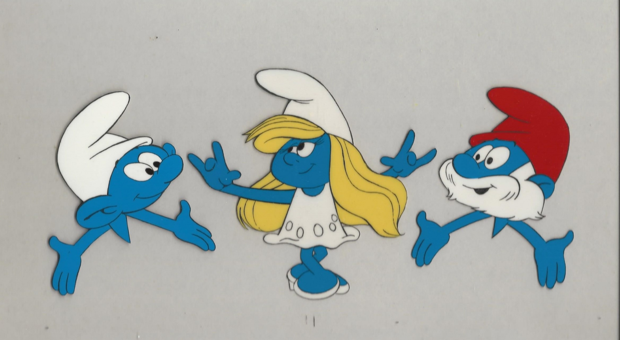 This is an original hand painted production cel of The Smurfs. Featured here is Papa Smurf dancing with Smurfette and a fellow Smurf. Note: this cel comes with a gallery certificate of authenticity.50