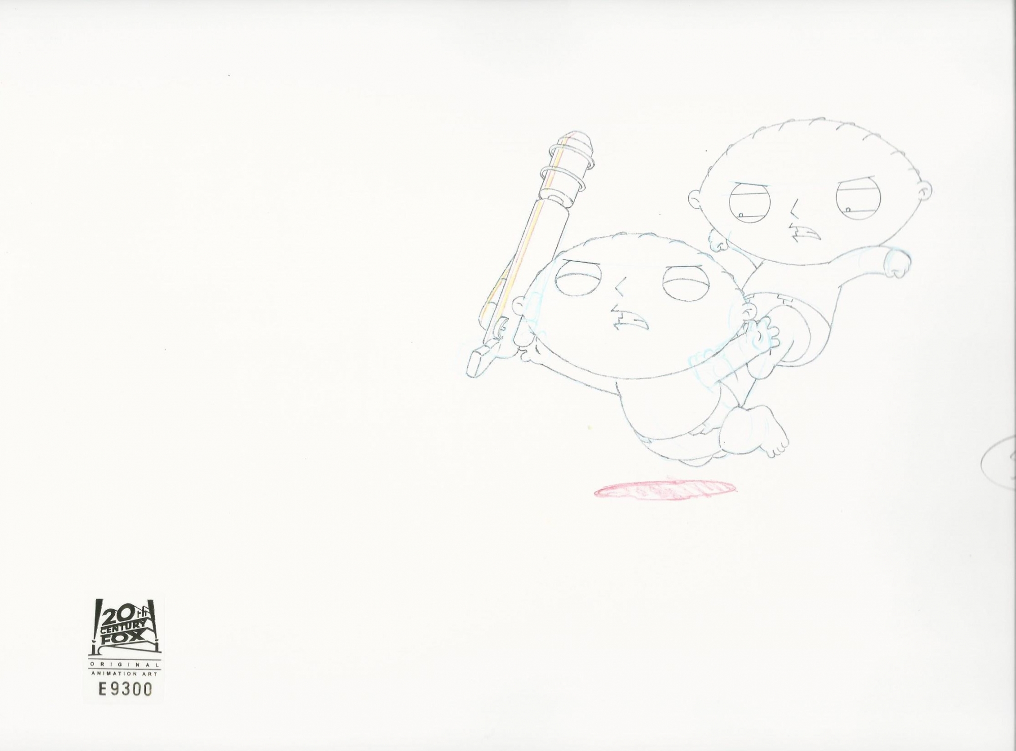 This is an original production drawing used in making an episode of "Family Guy". Episode title "The Hand That Rocks the Wheelchair" March 6, 2011. Featured here is Stewie.140