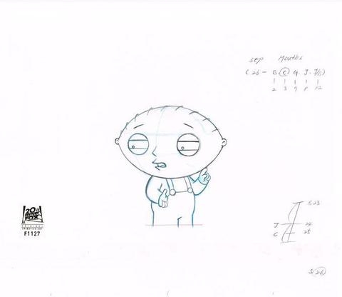This is an original production drawing used in making an episode of "Family Guy". Episode title "The Thin White Line" July 11, 2001. Featured here is Stewie Griffin.