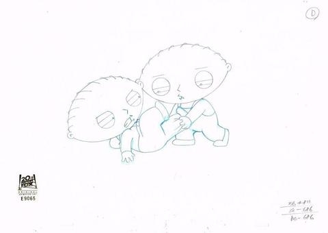 This is an original production drawing used in making an episode of "Family Guy". Episode title "The Hand that Rocks the Wheelchair" March 6, 2011. Featured here is Stewie Griffin and evil Stewie.140