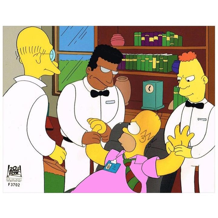 This is an original production cel used in making an episode of "The Simpsons". Episode title "Stark Raving Dad" Sept. 19, 1991. Featured here is Homer Simpson.