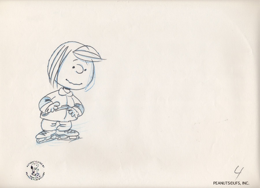 This is an original production drawing that has been personally signed by the late Bill Melendez. This was used in the making of "She's a Good Skate, Charlie Brown" 1980. Featured here is Peppermint Patty.