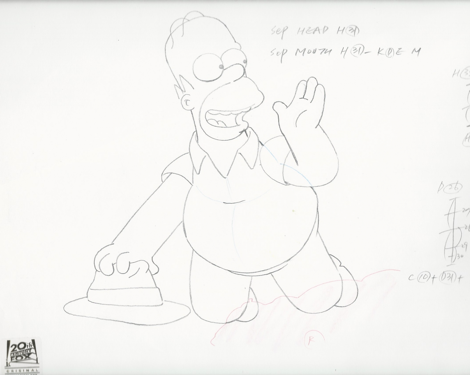 This is an original drawing used in making an episode of "The Simpsons". Episode title "Homer the Moe" November 18, 2001. Featured here is Homer Simpson. Note: there is a crease on the paper from left to right. This will sometimes happen during the production process and does not affect the value. 225