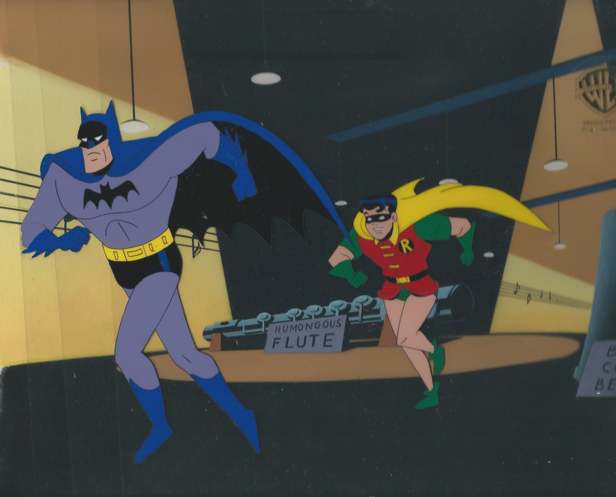 This is an original hand painted production cel on hand painted production background. This was used in making "The New Adventures of Batman/Superman Adventures" episode "Legends fo the Dark Knight" September 1997. Featured here is Batman and Robin.950