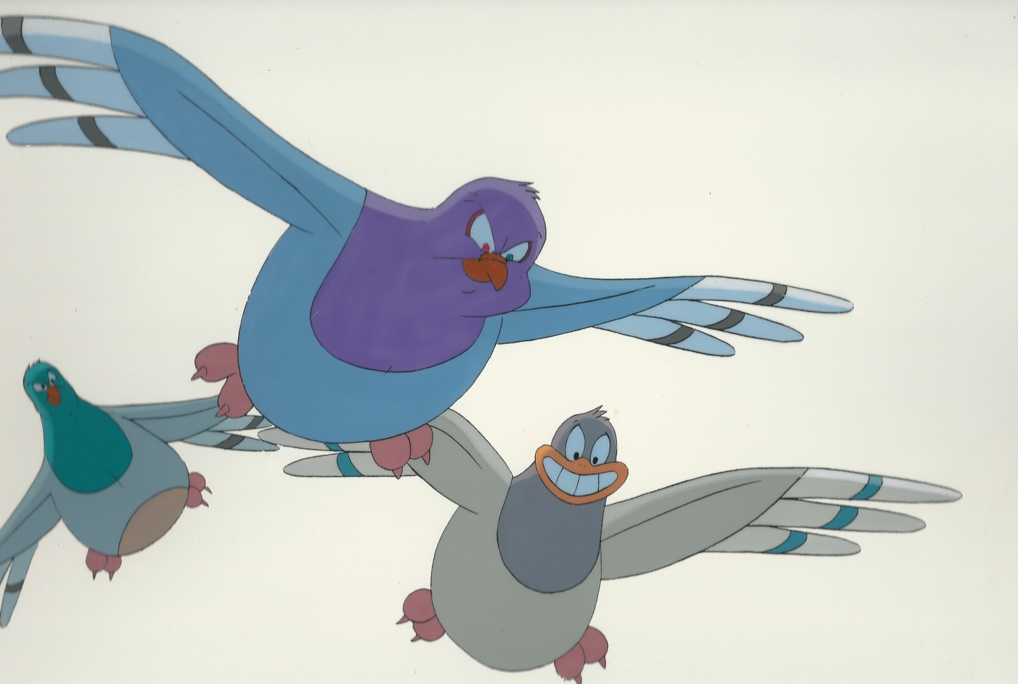 This is an original hand painted production cel with matching production drawing used in making "Goodfeathers" 1993-1998. The Goodfeathers were characters in the cartoon TV series "Animaniacs" that were obvious pigeon parodies of Ray Liotta, Robert De Niro, and Joe Pesci's roles in Goodfellas. Featured here is Pesto, Bobby and Squit.75