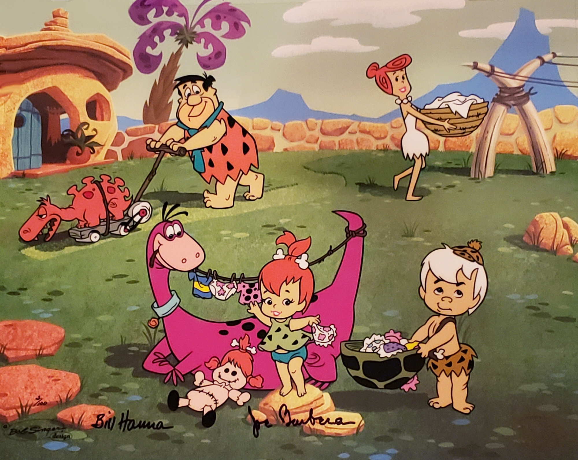 This is a hand painted limited edition cel. Each is signed by the late Bill Hanna and Joe Barbera. Featured here is Fred Flintstone, Wilma Flintstone, Betty Rubble, Barney Rubble, Pebbles and BammBamm.