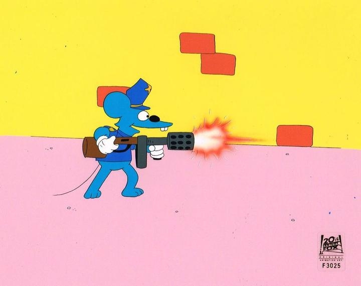 This is an original hand painted production cel used in making an episode of "The Simpsons". Episode 8F03 title "Bart the Murderer" October 10, 1991. Featured here is Itchy.440