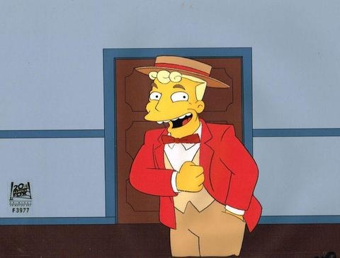 This is an original hand painted production cel used in making an episode of "The Simpsons". Episode 9F10 title "Marge vs. the Monorail" January 14, 1993. Featured here is Lyle Lanley voiced by the late Phil Hartman. "Well sir, there's nothing on Earth like a genuine, bona-fide, electrified, six-car monorail! What'd I say?". One of the best Simpsons episodes and written by Conan O'Brien. 610