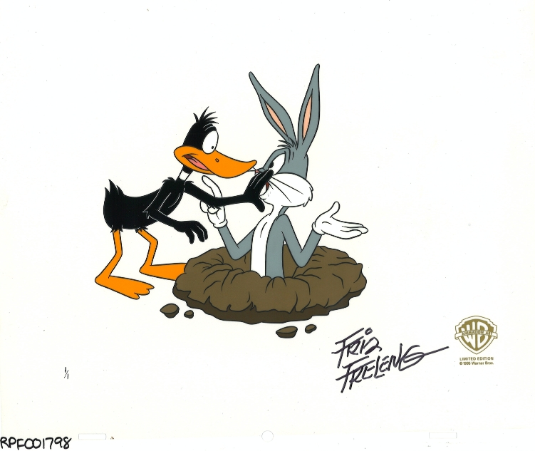 This is a hand painted 1 of 1 original cel matched with the original production drawing. Signed by the late Friz Freleng. This comes with 2 production drawings...one is Daffy and the other is Bugs Bunny. The drawings can be framed for an additional $125 each. 1050