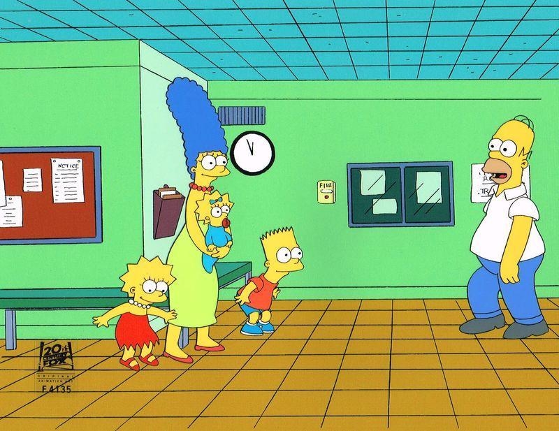 This is a hand painted original production cel used in making an episode of "The Simpsons". Episode 9F17 titles "So It's Come to This..." April 1, 1993. Featured here is Homer Simpson, Marge Simpson, Bart Simpson, Lisa Simpson and Maggie Simpson.