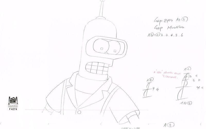 This is an original production drawing used in making an episode of "The Simpsons". Episode SABF16 titles "Simpsorama" November 9, 2014. "Simpsorama" is a crossover with Futurama, another animated series created by The Simpsons creator Matt Groening. In this crossover episode with "Futurama", that show's Planet Express crew arrives in modern day Springfield to keep the Simpsons from having a disastrous impact on the future. Featured here is Bender.