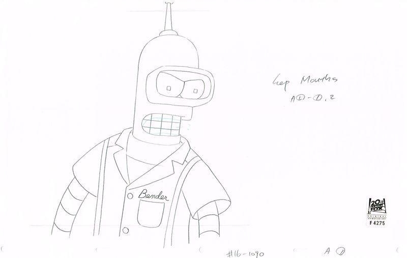 This is an original production drawing used in making an episode of "The Simpsons". Episode SABF16 titles "Simpsorama" November 9, 2014. "Simpsorama" is a crossover with Futurama, another animated series created by The Simpsons creator Matt Groening. In this crossover episode with "Futurama", that show's Planet Express crew arrives in modern day Springfield to keep the Simpsons from having a disastrous impact on the future. Featured here is Bender.