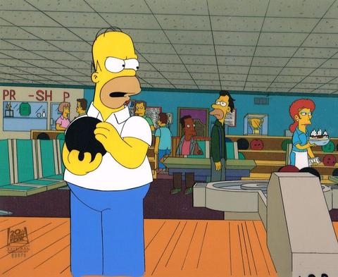 This is an original hand painted production cel used in making an episode of "The Simpsons". Episode BABF02 titled "Hello Gutter, Hello Fadder" November 14, 1999. In this episodeHomer blows off work and goes bowling with Lenny and Carl. When he bowls a 300 game, he becomes a local celebrity. But when his fleeting fame begins to fade, he finds little comfort in anything. Suicidal thoughts and a brush with death lead him to spend more time with Maggie, who learns to bowl and nearly upstages him. Featured here is Homer Simpson. This piece consists of 7 layers of cels! Very cool.645