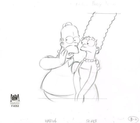 This is an original production drawing used in making an episode HABF06 of "The Simpsons". Episode title "The Seemingly Never-Ending Story" March 12, 2006. In this episode 13 of Season 17 Lisa tells an epic tale of being chased by a sheep. Then she meets Mr. Burns, who tells her about a Texan and a scavenger hunt, which results in Mr. Burns losing the power plant, but how does Bart's geography test fit in?...Featured here is Homer Simpson and Marge Simpson. 225