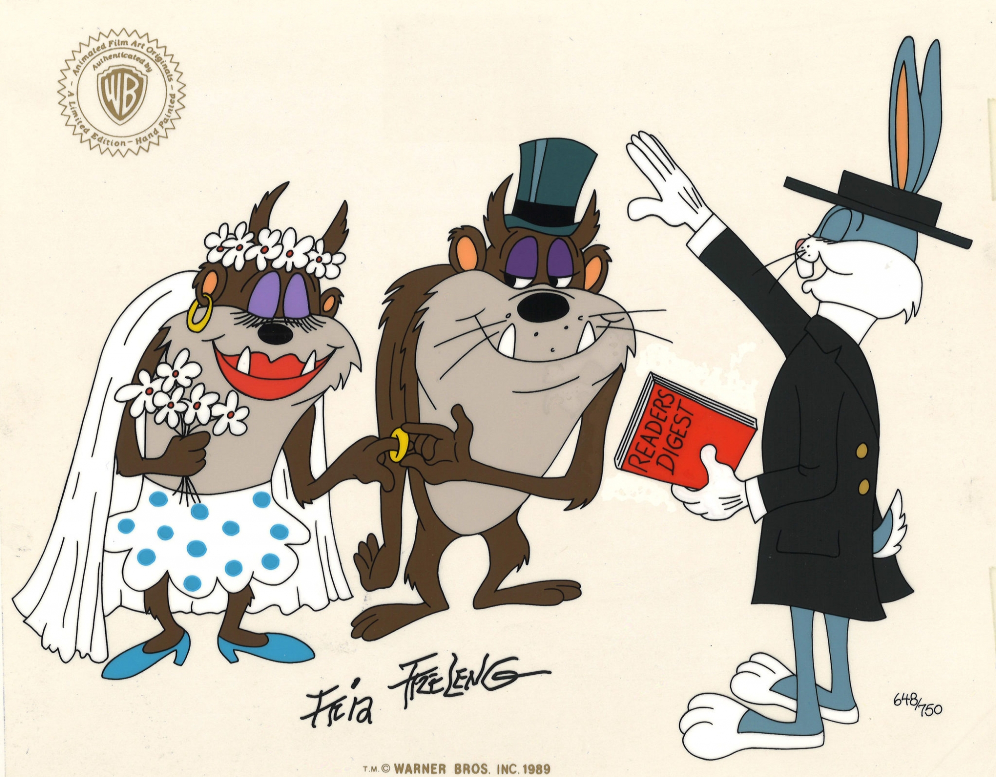 This is a hand painted limited edition cel. Bugs Bunny officiates over the Tasmanian Devil’s wedding. Taz’s blushing bride says “I do.” This cel has been personally signed by the late Friz Freleng and features Bugs Bunny, Taz and Mrs. Taz.