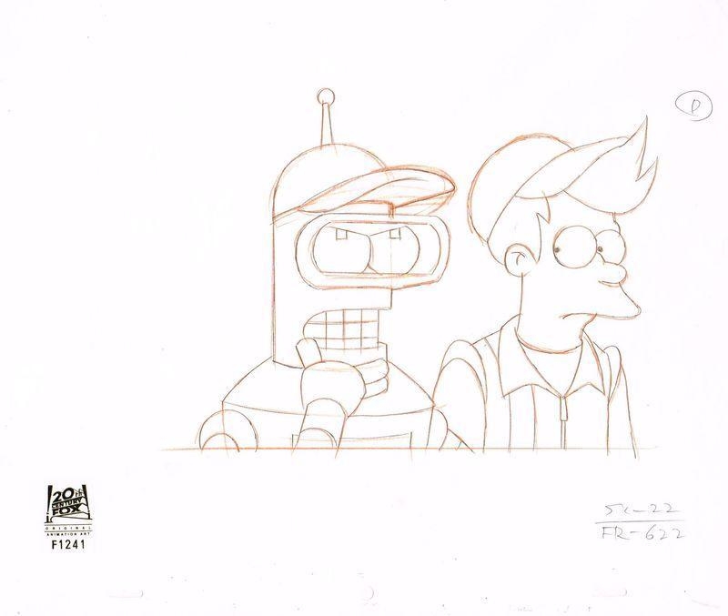 This is an original production drawing used in making episode of "Futurama". Episode title "Fry Am the Egg Man" August 11, 2011. Featured here is Bender and Fry. 200