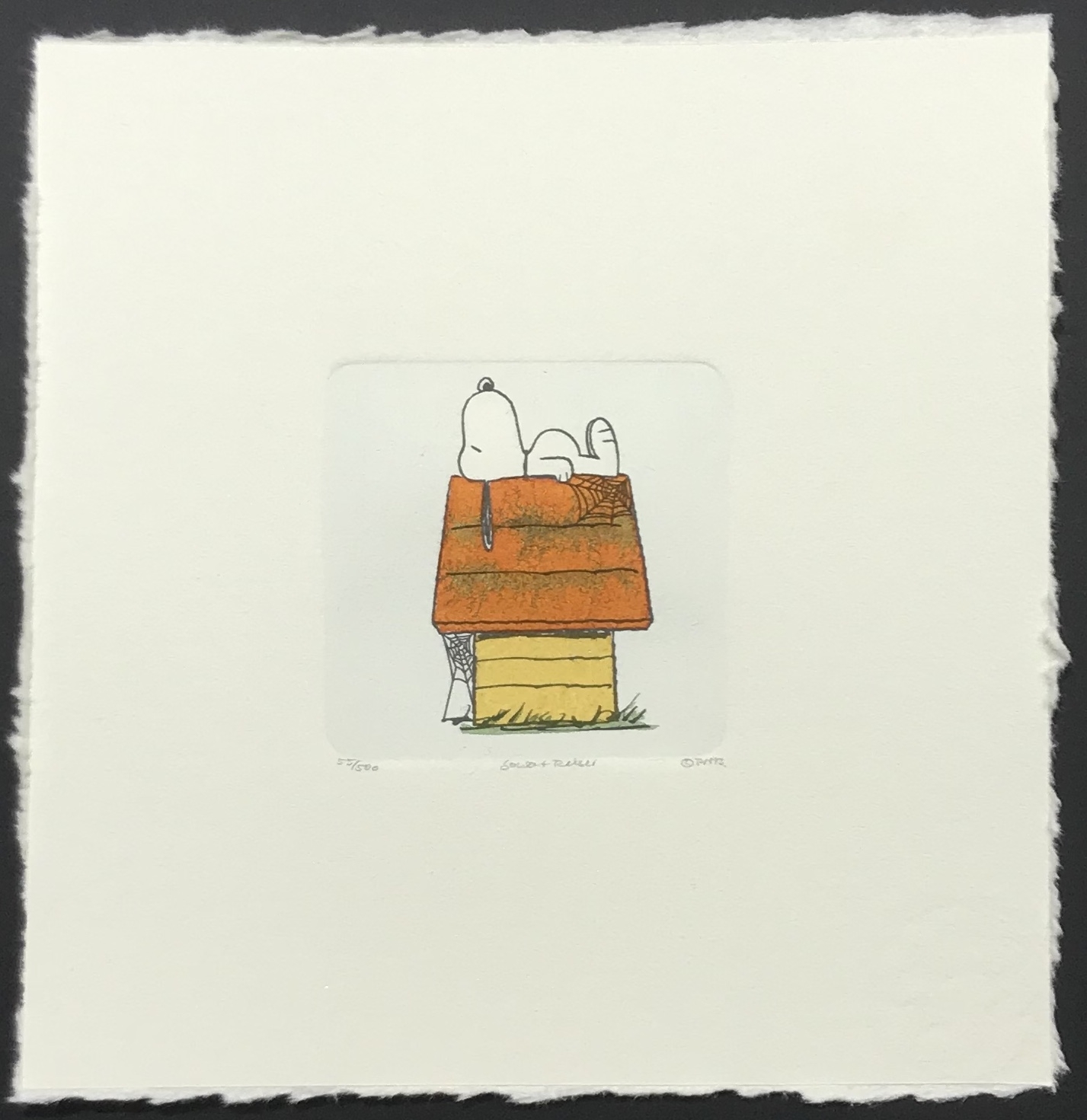 Snoopy rests on top of his doghouse in the beautiful hand painted etching. Also available framed for only $129US!.